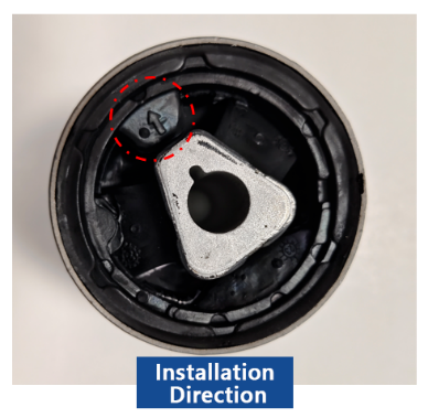 ఇన్స్టాలేషన్ సమయంలో, బషింగ్ యొక్క ఘన (నాన్-స్ప్లిట్) విభాగం వాహనం ప్రయాణం యొక్క క్షితిజ సమాంతర ఫార్వర్డ్ దిశతో సమలేఖనం చేయబడిందని నిర్ధారించుకోండి. బుషింగ్ ఓరియంటేషన్ బాణాన్ని కలిగి ఉంటే, ఈ బాణం తప్పనిసరిగా ప్రయాణ దిశలో ముందుకు చూపాలి.