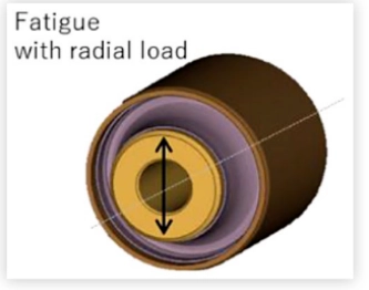 సస్పెన్షన్ బషింగ్ కోసం ఫెటీగ్ సిమ్యులేషన్ ఫలితాల యొక్క హై రేఖాచిత్రం సంపీడన ఒత్తిడి నిష్పత్తుల క్రింద పగుళ్లను వెల్లడిస్తుంది. తన్యత మరియు సంపీడన లోడ్లు రబ్బరు పదార్థానికి సమానంగా వర్తింపజేయబడినప్పటికీ, విశ్లేషణ వైఫల్యం చివరికి కుదింపులో ప్రారంభమవుతుందని సూచిస్తుంది.
