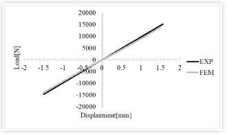 బుషింగ్ స్టిఫ్నెస్ కర్వ్ (ఫోర్స్-డిస్ప్లేస్మెంట్ కర్వ్) ప్రయోగాత్మక ఫలితాలతో పోల్చబడింది, ఇది స్థాపించబడిన FEM మోడల్ యొక్క ప్రామాణికతను మరింత రుజువు చేస్తుంది. బొమ్మ నుండి చూడగలిగినట్లుగా: పదార్థ పరీక్ష నమూనాల నుండి గుర్తించబడిన హైపర్లాస్టిక్ పారామితులను ఉపయోగించి విశ్లేషణ లోడ్-స్థానభ్రంశం రేఖాచిత్రంలో ప్రయోగాత్మక మరియు విశ్లేషణాత్మక ఫలితాల మధ్య మంచి స్థిరత్వాన్ని ప్రదర్శిస్తుంది.