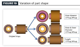 [అలసట విశ్లేషణ సాంకేతికత ద్వారా సమర్థవంతమైన వాహన ఉత్పత్తి రూపకల్పన ప్రక్రియను ఏర్పాటు చేయడం] వైబ్రేషన్-ఐసోలేటింగ్ రబ్బరు భాగాల కోసం ప్రతిపాదిత అలసట విశ్లేషణ సాంకేతికతను వర్తింపజేయడం, రేఖాగణిత వైవిధ్యం (రబ్బరు వాల్యూమ్) మరియు మన్నిక పనితీరు మధ్య సంబంధాన్ని పరిశోధించడానికి అదే పదార్థంతో తయారు చేయబడిన భాగాలపై పారామెట్రిక్ అధ్యయనం నిర్వహించబడింది. కాంపోనెంట్ జ్యామితి అసలు భాగం డిజైన్ నుండి తీసుకోబడింది, వీటిలో మోడల్ చేసిన వైవిధ్యాలు ఉన్నాయి: